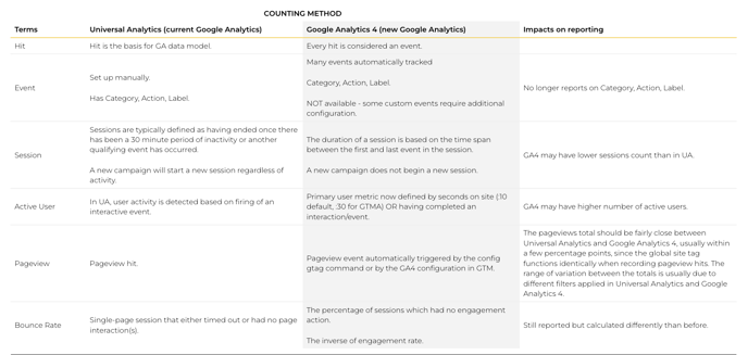 Here is a summary of the fundamental changes in model from the prior Universal Analytics to the new GA4: